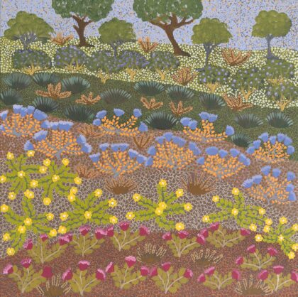 Life experience and culture come alive within the artwork produced for the Artists of Ampilatwatja latest exhibition Alpeyt (Blossom). Each painting pays homage to the significance and use of traditional bush medicine while depicting traditional knowledge of dreaming and country through the translation of waterholes and soaks, bush medicines, snaking dry creek beds, mountains and sand hills.