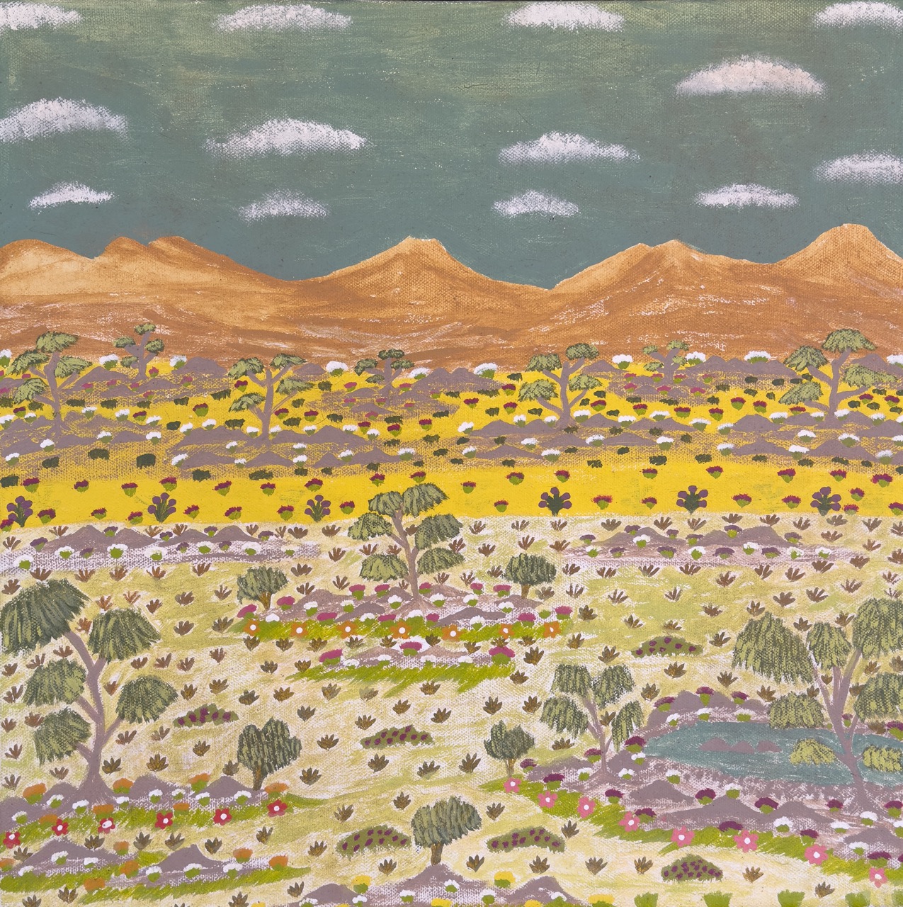 My mothers country is flowers, trees and mountains. I love to paint them. We see springs, the water from the springs is like rainwater, fresh and clean. We hunt goanna and turkeys, we roast them in the fire and the flesh is strong and sweet.