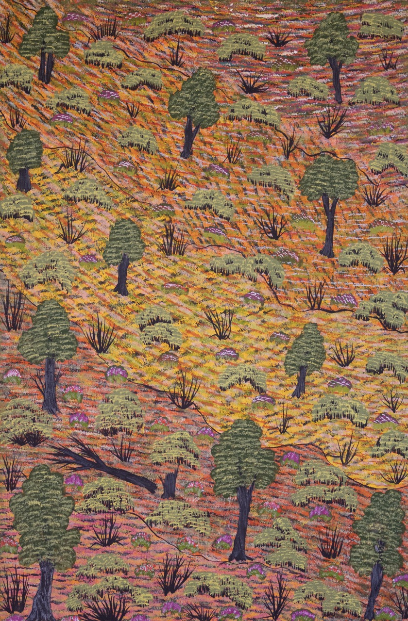 The community of Ampilatwatja made a conscious decision not to paint ‘altyerr’(dreaming stories). The artists paint their country where those stories sit.