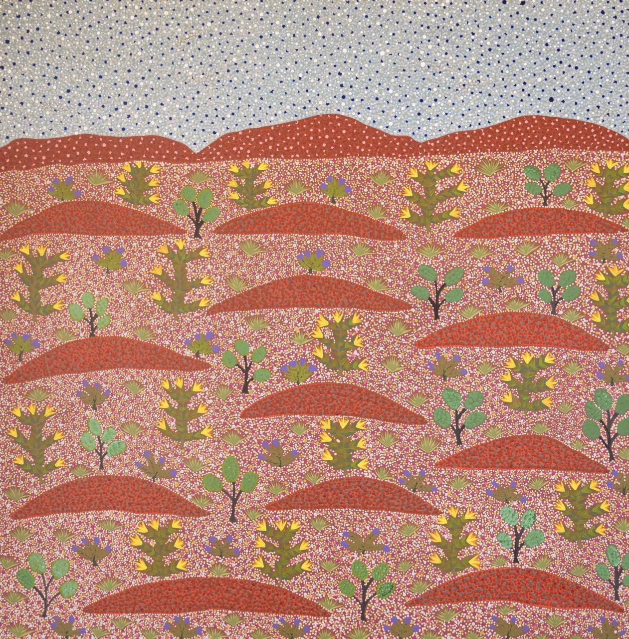 The community of Ampilatwatja made a conscious decision not to paint altyerr (dreaming stories). The artists paint their country where those stories sit.