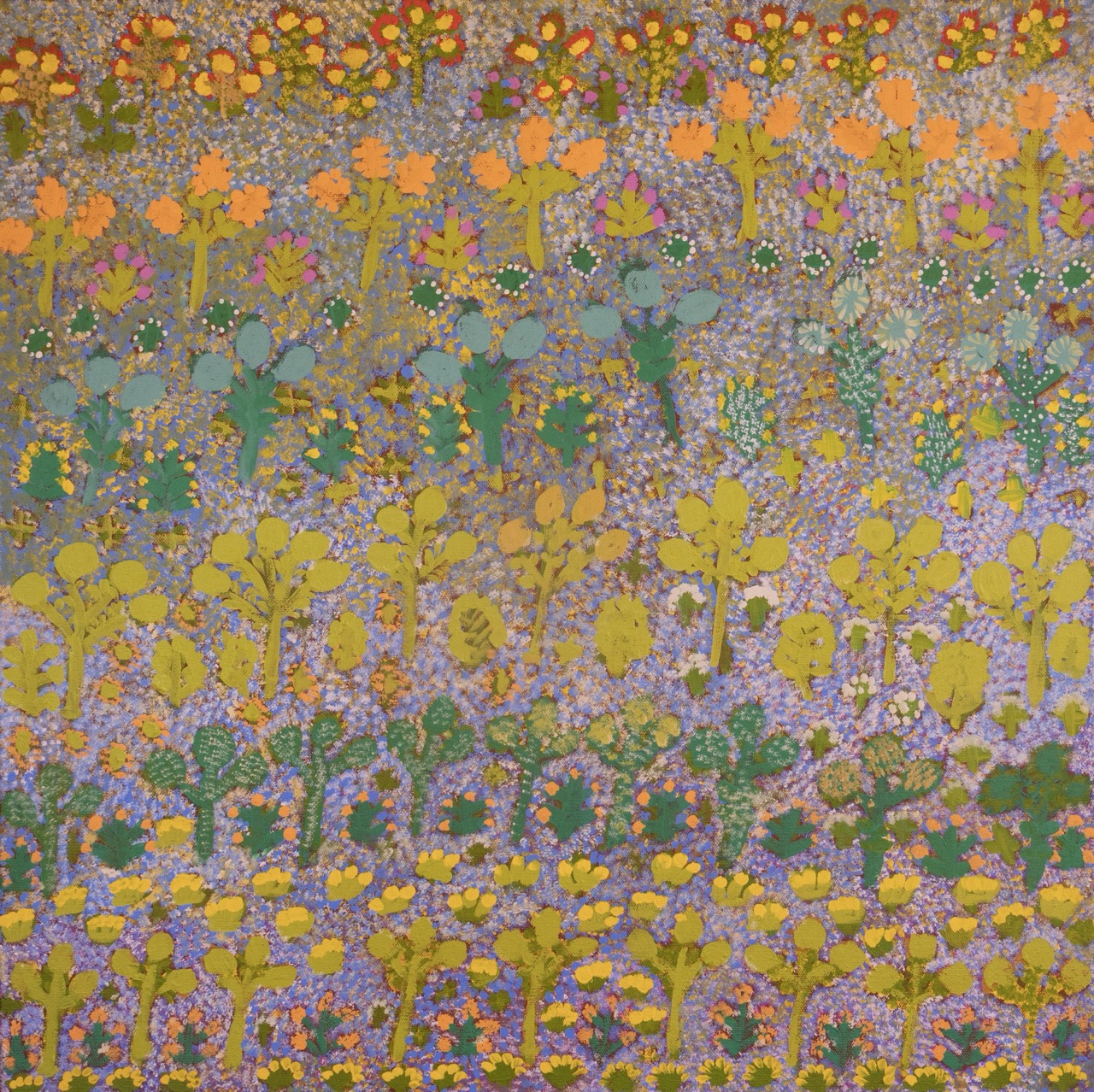 The community of Ampilatwatja made a conscious decision not to paint altyerr (dreaming stories). The artists paint their country where those stories sit.