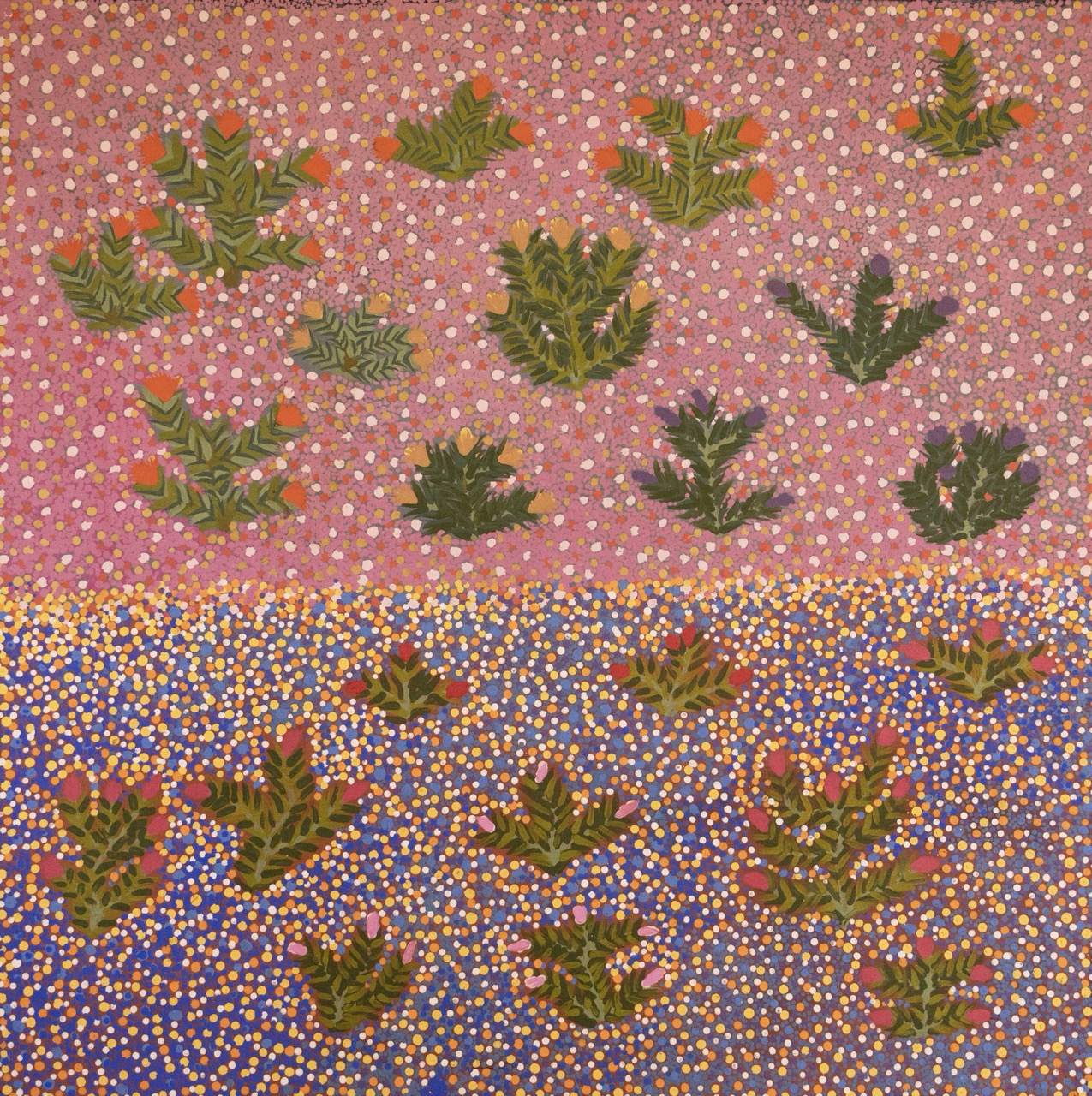I was born in Irrultja, my father's country. I paint therrpeyt, a plant with red and pink flowers, it is my family symbol. You can suck the flowers to get a sweet honey from. You can wash your body with the leaves to heal sores and clean your body. I paint arreth which grows in the rocky ground and helps fix my sore throat when I make a hot tea from the leaves. I love to paint, I feel happy when I paint, I feel busy and good.
