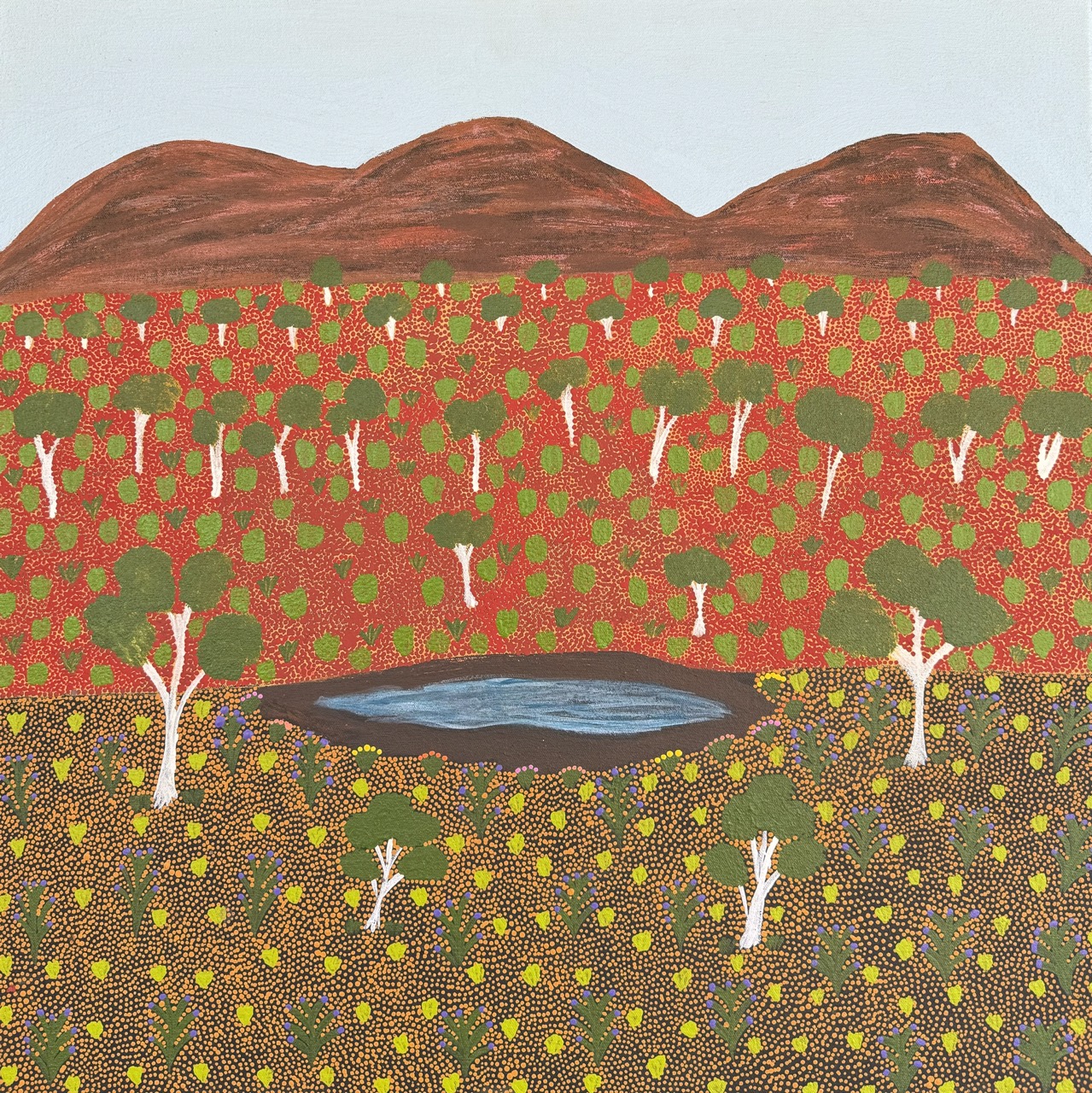 This painting shows the layered landscape of Alyawarr, Central Australia. Knowing your country is an important part of living in a remote community like Ampilatwatja. Knowing when and where to go hunting and gathering, knowing where there is 'soakage' (where you can dig for water), travelling with family for ceremonies, and maintaining a connection with the land.